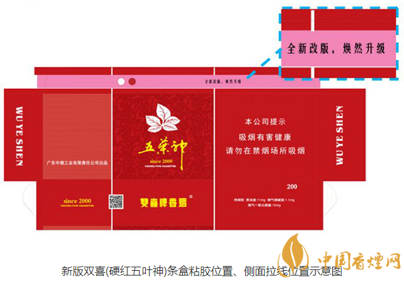 1、條盒拉線改為帶wuyeshen101字樣的銀底鐳射拉線;側(cè)面拉線位置增加單一二維碼。
