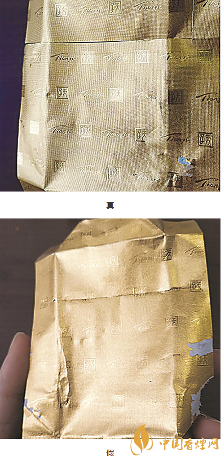 5、錫箔紙。在一定側(cè)光角度下,真煙錫箔紙印刷清晰,有光澤,凹凸感強;假煙則字跡不清,色澤暗淡,沒有立體感。
