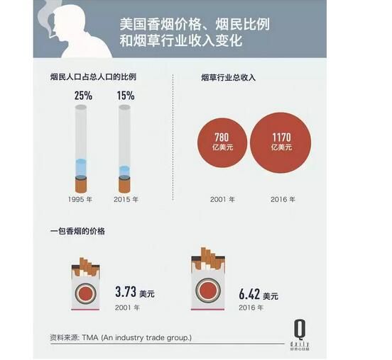 根據(jù)市場調(diào)研公司的報告,2001 年至 2016 年期間,美國香煙的銷售數(shù)量減少了 37%,與此同時,美國吸煙人口的比例也下降了,但煙草公司的利潤卻上升了。在2016 年,美國煙草行業(yè)的利潤達(dá)到了 184 億美元。(跟我國一比這好像都不算什么了)