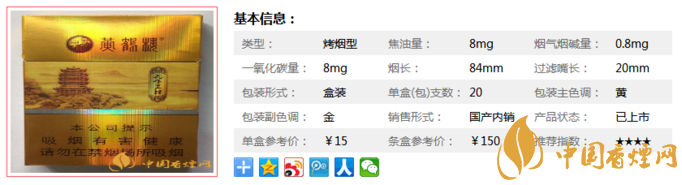 | 類型 :烤煙型 | 焦油量 :8mg | 煙氣煙堿量 :0.8mg | 一氧化碳量 :8mg |