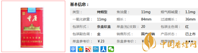 重慶紅香煙,煙長84mm,過濾嘴長:36mm,焦油量11mg,采用濾嘴通風技術(shù),有效降低了煙氣中有害物質(zhì)的含量,順應了目前降焦減害的發(fā)展方向。味道醇淡順口,比較合口味,總得來說很不錯,煙燃燒很好,口感一般,偶爾抽抽還是可以。
