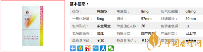 | 類型 :烤煙型 | 焦油量 :8mg | 煙氣煙堿量 :0.8mg | 一氧化碳量 :8mg |