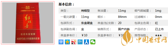 “百順”紅雙喜運(yùn)用了特殊的保潤技術(shù),確保煙香和水份不會隨煙包打開而過快流失,燃燒速度不快,煙支也不易折斷。下面我們一起來看紅雙喜硬百順香煙的參數(shù)信息:焦油量:11mg 煙堿量:1mg 一氧化碳量:11mg