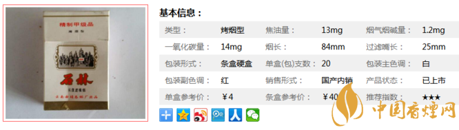 石林硬香煙,煙支長(zhǎng)84mm,在開發(fā)過(guò)程中,經(jīng)與國(guó)外有實(shí)力的知名香料公司多次進(jìn)行合作研究,研發(fā)試驗(yàn)200多次,最賦予該產(chǎn)品獨(dú)特的加香加料風(fēng)格。下面我們一起來(lái)看石林硬的參數(shù)信息:焦油量:13mg 煙堿量:1.2mg 一氧化碳量:14mg.