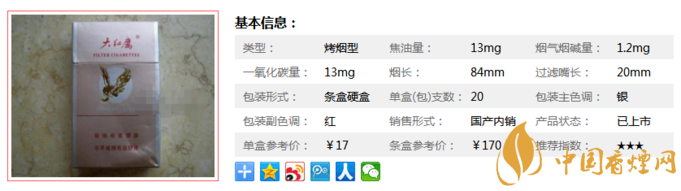 這款煙感覺還算可以,味道純正、品質(zhì)工整,沒有什么明顯的缺點(diǎn)。當(dāng)年這個(gè)煙在浙江是非常火的,年輕人的首選,包裝設(shè)計(jì)年輕化,口感也很好,當(dāng)時(shí)候的大紅鷹口感比較像云南煙,煙氣柔和,香氣清甜,回味清爽,抽過的人很難挑出毛病,除了高昂的價(jià)格。估計(jì)浙江中煙確實(shí)把主要精力投入到利群品牌上了,大紅鷹只是在吃老本。好在大紅鷹(銀)還算屬于中檔的產(chǎn)品。經(jīng)香煙網(wǎng)小編市場(chǎng)調(diào)查大紅鷹銀售價(jià)為17元/包。