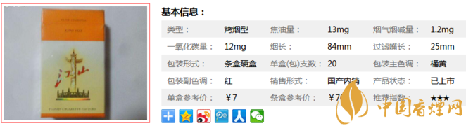 “江山”牌低危害卷煙通過科學(xué)的配方手段;利用先進的添加技術(shù),添加了大量的名貴中草藥提取液,每支煙中含有0.5%的“仙芪補腎顆粒”新型料液,它是由精選的淫羊藿、白芍、仙茅、黃芪、柴胡等多味中草藥嚴格按照現(xiàn)代制藥技術(shù)精練濃縮而成下面我們一起來看江山精品的參數(shù)信息:焦油量:13mg. 煙堿量:1.2mg. 一氧化碳量:12mg.