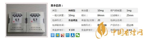 類型 :烤煙型 焦油量 :10mg 煙氣煙堿量 :1mg 一氧化碳量 :10mg