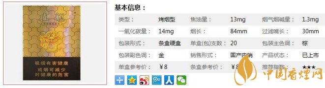 | 類(lèi)型 :烤煙型 | 焦油量 :13mg | 煙氣煙堿量 :1.3mg | 一氧化碳量 :14mg |