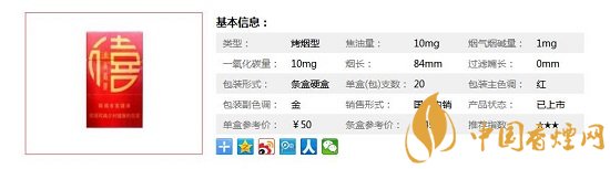 | 類型 :烤煙型 | 焦油量 :10mg | 煙氣煙堿量 :1mg | 一氧化碳量 :10mg |