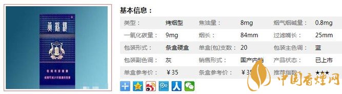 | 類型 :烤煙型 | 焦油量 :8mg | 煙氣煙堿量 :0.8mg | 一氧化碳量 :9mg |