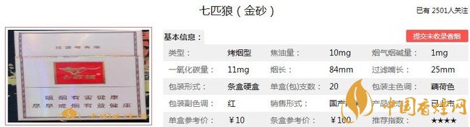 七匹狼金砂煙支長84mm,過濾嘴:25mm,這款七匹狼的包裝款式簡潔大方,煙氣飽滿充足,降焦不夠明顯,但是沒什么香氣,勁道適中,口感比較一般,入口有點雜氣,入喉有點刺激感,感覺沒什么特色,味道平和普通。下面我們一起來看七匹狼金砂的參數(shù)信息:焦油量:10mg 煙堿量:1mg 一氧化碳量:11mg