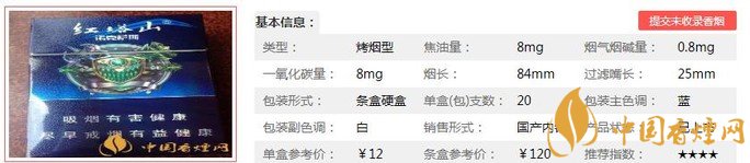 | 類型 :烤煙型 | 焦油量 :8mg | 煙氣煙堿量 :0.8mg | 一氧化碳量 :8mg |