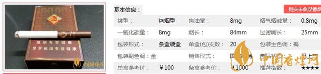 | 類型 :烤煙型 | 焦油量 :8mg | 煙氣煙堿量 :0.8mg | 一氧化碳量 :8mg |