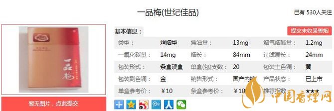 一品梅香煙創(chuàng)牌于1991年,是淮陰卷煙廠(現(xiàn)屬江蘇中煙)的代表品牌,一品梅取自“臘梅,花中一品”之意。煙氣純凈,清雅,恰到好處的醇厚帶來不一般的輕盈。經(jīng)香煙網(wǎng)小編市場調(diào)查一品梅世紀(jì)佳品售價為10元/包。
