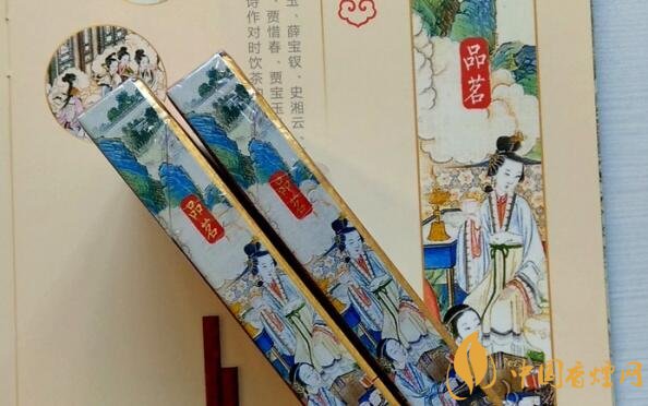 “一部《紅樓夢(mèng)》,滿紙茶葉香”,古典名著《紅樓夢(mèng)》中描寫(xiě)茶文化的篇幅廣博,細(xì)節(jié)精微,蘊(yùn)意深遠(yuǎn),為中國(guó)小說(shuō)史上所罕見(jiàn)。在“南京十二釵”香煙的包裝上就有“妙玉奉茶”的經(jīng)典故事。紅樓卷香煙上的“品茗”,按照畫(huà)冊(cè)右邊的“菊花詩(shī)社”,展示的是林黛玉、薛寶釵、史湘云、賈探春等人在吟詩(shī)作對(duì)時(shí)品茶的情景。