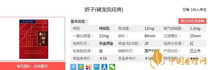 以上便是由香煙網(wǎng)小編為大家介紹的關(guān)于嬌子硬龍鳳經(jīng)典價格及參數(shù) 嬌子硬龍鳳經(jīng)典獨(dú)家口感分析的相關(guān)信息,想要了解更多有關(guān)內(nèi)容請點擊:嬌子軟龍鳳呈祥售價10元一包 煙氣細(xì)膩口感舒適