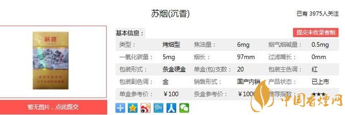 蘇煙沉香,其價(jià)位應(yīng)該是細(xì)支香煙中最高的品牌香煙。蘇煙沉香香氣優(yōu)雅協(xié)調(diào),沉香香氣獨(dú)特、高雅,且與煙草本香完美融合,煙氣細(xì)膩,濃度和勁頭適中、口感舒適生津。經(jīng)香煙網(wǎng)小編市場(chǎng)調(diào)查蘇煙沉香售價(jià)為100元/包。