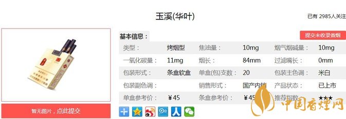 玉溪華葉煙支長(zhǎng)84mm,過濾嘴長(zhǎng)25mm,湛藍(lán)色的煙嘴搭配金波水浪紋,上方除了金色為底暗紅色華葉繁體字logo,還有和煙盒右上角印章類似的金色圖案,上面寫著:華葉天成,天賜本香。下面我們一起來看玉溪華葉的參數(shù)信息:焦油量:10mg 煙堿量:1.0mg 一氧化碳量:11mg