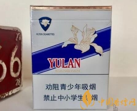 正面來看,頂部可以看到一條金色的邊框,下方是一條鐳射線條,在左上角可看到藍(lán)色為底的類似鉆石logo的圖案,上面有一朵白色的玉蘭花,圖案下方寫著“過濾嘴香煙”,中間是藍(lán)色為底的斜條長方形樣式,上方也是一朵白色玉蘭花和“玉蘭香煙”四個(gè)字,這算是很經(jīng)典的玉蘭香煙logo圖案了,最下方是警示標(biāo)語。背面跟正面差不多,整體包裝富有很濃郁的復(fù)古海報(bào)的風(fēng)格。