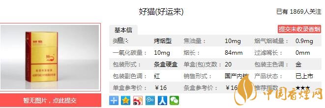 應(yīng)用新型保潤技術(shù)有效降低了煙氣的干燥感和刺激性,煙氣醇和溫潤,余味干凈舒適,口感甜潤柔和,給消費者帶來“天然、輕松、舒適”的吸食體驗。經(jīng)香煙網(wǎng)小編市場調(diào)查好貓好運來售價為16元/包。