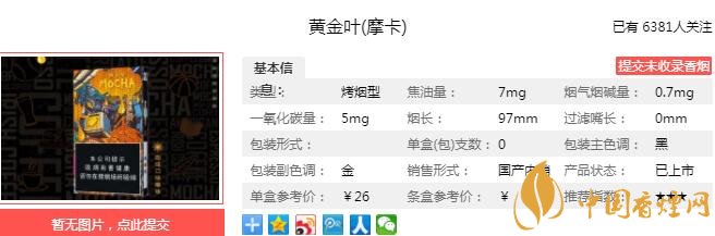 黃金葉摩卡煙支長97mm,煙嘴設(shè)計(jì)為暗金色,甜甜的有點(diǎn)像煊赫門,煙支拿在手上十分舒適。下面我們一起來看黃金葉摩卡的參數(shù)信息:焦油量:7mg 煙堿量:0.7mg 一氧化碳量:5mg