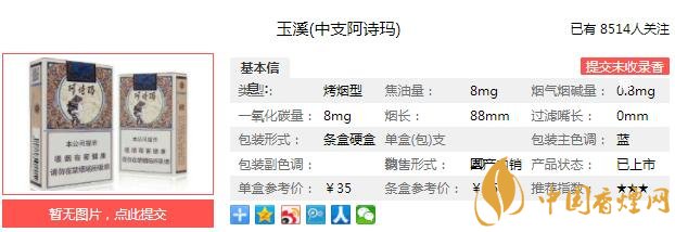 玉溪中支阿詩瑪煙支長(zhǎng)88mm,濾嘴的中部是阿詩瑪標(biāo)志性的側(cè)影頭像。濾嘴下部是上下兩個(gè)圓環(huán),中間正反印制著阿詩瑪和Ashima標(biāo)識(shí)。下面我們一起來看玉溪中支阿詩瑪?shù)膮?shù)信息:焦油量:8mg 煙堿量:0.8mg 一氧化碳量:8mg