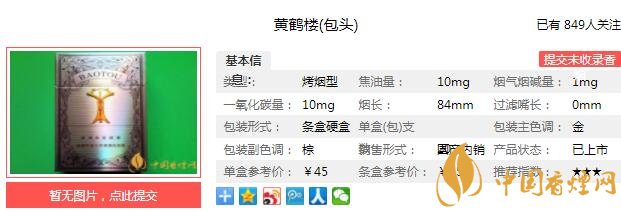 黃鶴樓包頭煙支長84mm,黃色水松紙上打有一排激光孔,濾嘴上有包頭市徽圖案和BAOTOU的拼音煙,身也有刻度線,綠線是3,黃線是5。下面我們一起來看黃鶴樓包頭的參數(shù)信息:焦油量:10mg 煙堿量:1.0mg 一氧化碳量:10mg