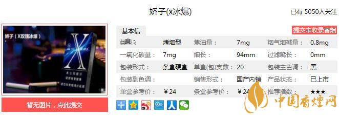 嬌子X冰爆煙支長94mm,過濾嘴長35mm,過濾嘴頂端是普通的海綿體結構,并無瓦楞槽,過濾嘴一側印有爆珠的標識,另一側印有X的LOGO,煙支整體比較精美。下面我們一起來看嬌子X冰爆的參數(shù)信息:焦油量:7mg 煙堿量:0.8mg 一氧化碳量:7mg