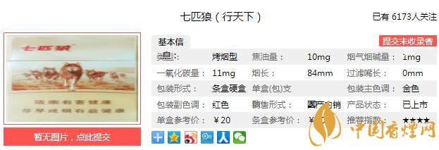 七匹狼行天下煙支長(zhǎng)84mm,過濾嘴長(zhǎng)34mm,卷紙采用橫紋結(jié)構(gòu),以手捏之,柔軟而充滿彈性。以鼻嗅之,煙草本香氣息不濃,夾雜著果木之香的氣味,充斥著鼻翼。下面我們一起來看七匹狼行天下的參數(shù)信息:焦油量:10mg 煙堿量:1.0mg 一氧化碳量:11mg