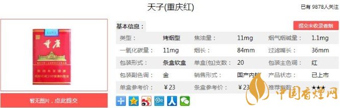 天子(重慶紅)三項(xiàng)理化指標(biāo)都是11mg或其倍數(shù),印有二維碼。激光防偽鐳射簽內(nèi)容,與煙盒正面一樣。過濾嘴下端還多了一圈金箍,并且卷紙上沒有圖案。過濾嘴也要比中華長(zhǎng)了一些,為36mm。過濾嘴上沒有單排或多排的降焦線。下面便是基本參數(shù):焦油量:11mg 煙堿量:1.1mg 一氧化碳量:11mg.