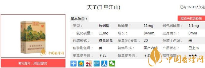 天子(千里江山)以重慶武陵生態(tài)地區(qū)優(yōu)質(zhì)煙葉為原料,匯聚綜合降焦與減害技術等集成應用,在降低有害氣體同時使煙氣更加清香雅致。下面便是天子(千里江山)的基本參數(shù):焦油量:11mg 煙堿量:1.1mg 一氧化碳量:11mg.