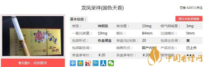 這款香煙左右兩側(cè)為紅色,分為三段式設(shè)計:上下兩段有波浪紋飾的暗紋,左側(cè)是全部為10mg和1.0mg的理化指標(biāo)。白色豎紋卷煙紙上無編碼與文字,拆開煙支,在濾嘴處有兩排激光降焦孔。煙支長84mm,濾嘴占去37mm。下面便是龍鳳呈祥(國色天香)的基本參數(shù):焦油量:10mg 煙堿量:1.0mg 一氧化碳量:10mg.