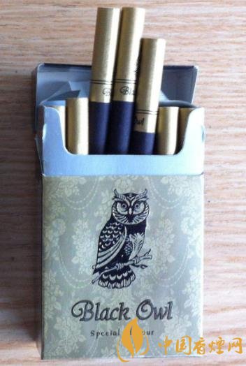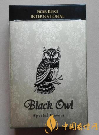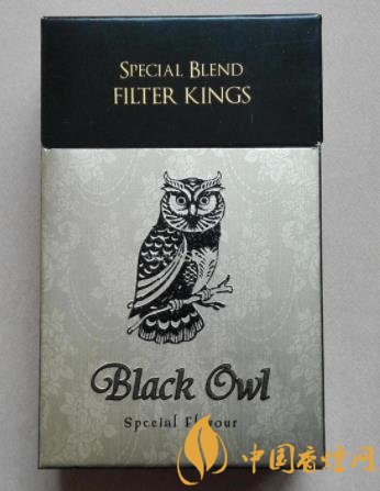 此煙的外包裝還不錯,正反面都是貓頭鷹的頭像,給人很清爽的感覺,盒蓋和四周都是黑色的,正反面主體是淡金色的,還有暗花的花紋。正面的主體圖案就是一只站在樹枝上的貓頭鷹還是凸版印刷的,下方就是品名BLACK OWL黑貓頭鷹,品名下還有Special Flavour特殊香味,盒蓋上用燙金字體印著FILTER KINGS過濾嘴式,上方還有SPECIAL BLEND特殊混合型。