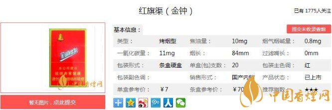 金鐘香煙的包裝,雖然看上去不像是特別高檔的香煙,但是煙嘴看著挺上檔次的。在那個(gè)年代能有這樣的降焦設(shè)計(jì),可以說(shuō)是非常的不錯(cuò)了,滿(mǎn)滿(mǎn)的科技感。下面便是紅旗渠(金鐘)的基本參數(shù):焦油量:10mg 煙堿量:0.8mg 一氧化碳量:11mg.