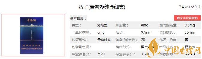 以上便是香煙網(wǎng)小編為大家介紹的關(guān)于嬌子青海湖純凈多少錢一包 青海湖純凈價格及圖片介紹的相關(guān)信息,看完之后大家是不是對于嬌子(青海湖純凈)這款香煙的相關(guān)信息更加了解呢。大家還想查詢更多的相關(guān)內(nèi)容歡迎點擊:嬌子青海湖細(xì)支香煙多少錢一包 嬌子青海湖細(xì)支參數(shù)