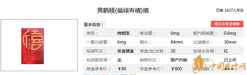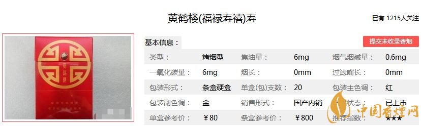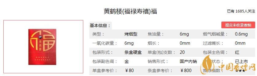 福祿壽喜代表著吉祥安康的寓意,黃鶴樓香煙為此開發(fā)出的黃鶴樓福祿壽喜香煙,福代表幸福美滿;祿代表升官發(fā)財(cái);壽代表健康長壽;喜代表喜事。黃鶴樓福祿壽喜價(jià)格及參數(shù)如下: