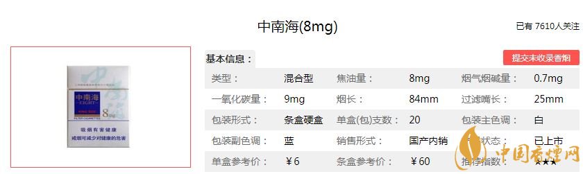 中南海香煙相信各位煙民們都不陌生,他是北京的香煙品牌,曾經(jīng)是毛主席的口糧。今天為大家介紹一款中南海8mg香煙。那么中南海8mg多少錢一包?為了讓大家對這款香煙更加了解,下面為大家介紹一下中南海8mg香煙價(jià)格表圖以及各地最新零售價(jià)格。