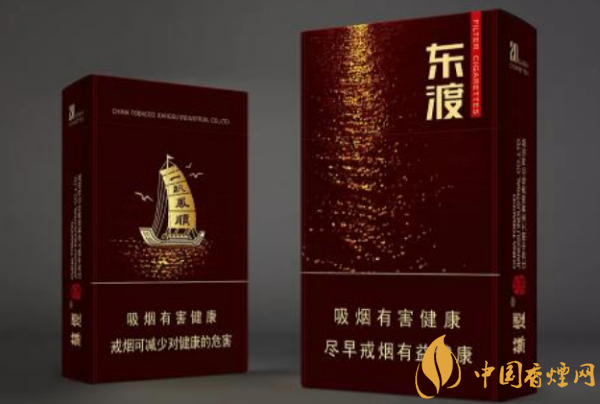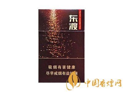 盒子正面翻蓋右側(cè)有金色豎排的“東渡”品名,過濾嘴香煙的英文filter cigarette列于其旁,主圖案除了品名外就是稍稍靠左的日暉圖案,像朝陽斜映在波光粼粼的水面,反射出點(diǎn)點(diǎn)金光,顯得非常有意境;