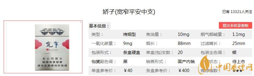 做為寬窄系列家族新成員,嬌子(寬窄平安中支)也已登臺亮相。在寬版粗支、細支、短支等測試版本之后,最終推出了中支版本的平安,并在2018年驚艷上市。味道傳承了寬窄系列的細膩典雅,又有其自身的溫潤柔媚,是一款質高價美的卷煙產品。經小編市場調查嬌子(寬窄平安中支)售價為40元/包。