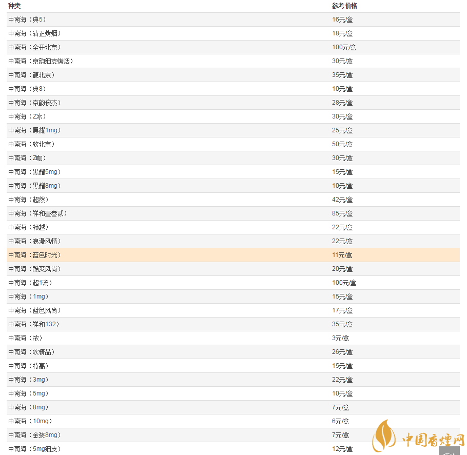中南海香煙價格表