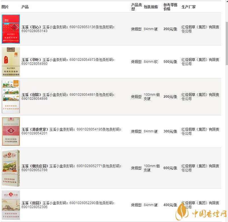 玉溪煙價格表和圖片大全