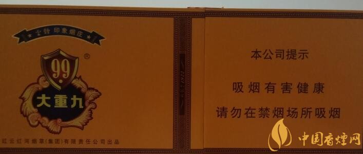 細支煙風頭正盛,大重九當然也不能孤芳自賞,總得還是要有奴嬌伴其左右,細支大九采用硬盒包裝,無雜質的金礦黃襯托盾牌花邊“大重九”。背面是麥穗包裹“99”,簡單大氣的包裝卻不失豪華端莊。我們在對云煙大重九細支價格表圖的介紹之前,先來說說云煙細支大重九多少錢這款香煙的零售參考價為100元。