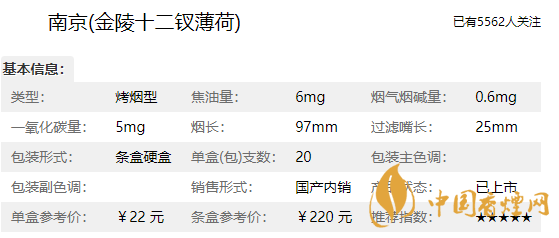 南京金陵十二釵薄荷煙外觀清新典雅,以淡綠色為主色調(diào),配以金陵十二釵美人圖,格調(diào)清新淡雅。整個(gè)煙包精致優(yōu)雅,煙支纖細(xì)超長(zhǎng)別致,個(gè)性鮮明,煙香優(yōu)雅而飄逸,口感細(xì)膩柔和,超低的焦油量,勁道適中,價(jià)格適宜。深受廣大煙民的喜愛(ài),特別是女性煙客對(duì)它格外青睞。據(jù)小編調(diào)查得知市場(chǎng)銷售參考價(jià)為22元/包