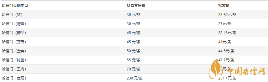 哈德門產(chǎn)品系列共有八種香煙產(chǎn)品,其中除了哈德門(壹號)每條零售價(jià)是230元之外,其他的七種香煙產(chǎn)品,條盒零售價(jià)基本都是在30至55元之間,由于每條10盒,所以,每小盒的價(jià)格即在3至5元左右??梢?,哈德門香煙的價(jià)格是比較低廉的,也符合它“民品之名品”的稱號。