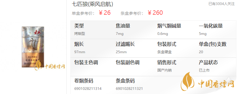 七匹狼·乘風(fēng)啟航香煙,有更多人直接叫它“乘風(fēng)”,由福建中煙出品,據(jù)香煙網(wǎng)小編了解到,七匹狼乘風(fēng)啟航香煙參考價(jià):26元/包。