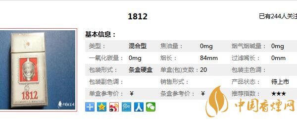 以上內(nèi)容是由香煙網(wǎng)小編為大家收集以及整理的關(guān)于,1812煙多少錢一包相關(guān)信息,想要了解更多信息詳情請點擊:銷量最好外煙品牌。