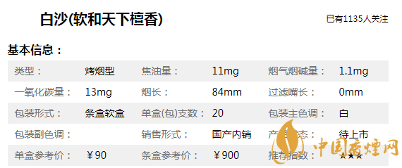 類型 :烤煙型 焦油量 :11mg 煙氣煙堿量 :1mg 一氧化碳量 :13mg