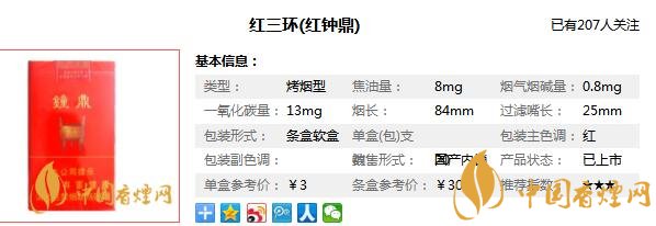 紅三環(huán)香煙是安徽中煙工業(yè)公司滁州卷煙廠于1984年創(chuàng)立的,當(dāng)時(shí)品牌立意為紀(jì)念中國女排在世界大賽中連續(xù)獲得三次世界冠軍,三環(huán)象征著三連冠,紅三環(huán)香煙被賦予了新的寓息,象征著廠家、商家和消費(fèi)者心心相印,緊密相連。那么在介紹紅鐘鼎香煙價(jià)格表之前,先來看看這款紅鐘鼎煙多少錢一包,這款香煙的售價(jià)為3元/包。