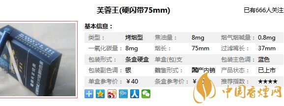 以上內容是由香煙網小編收集以及整理的關于,芙蓉王硬閃帶75mm多少錢一包以及芙蓉王硬閃帶75mm價格相關的信息,想要了解更多相關信息請點擊:芙蓉王爆珠煙多少錢。