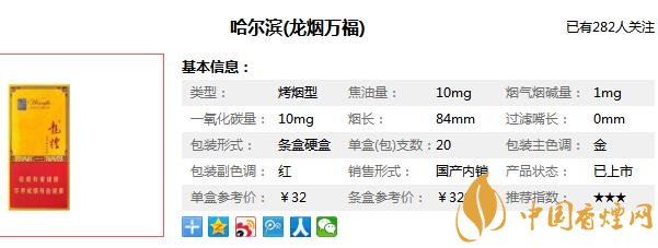 哈爾濱卷煙廠,是我國最早建立的一個卷煙廠,是我國歷史最老的廠之一,因為這個品牌的產(chǎn)品地域性要求非常的高,以至于這個品牌在當(dāng)今的發(fā)展趨勢下,逐步走向沒落,那么龍煙福萬多少錢一包,現(xiàn)在就由香煙網(wǎng)小編為大家介紹一下哈爾濱龍煙萬福價格圖片。